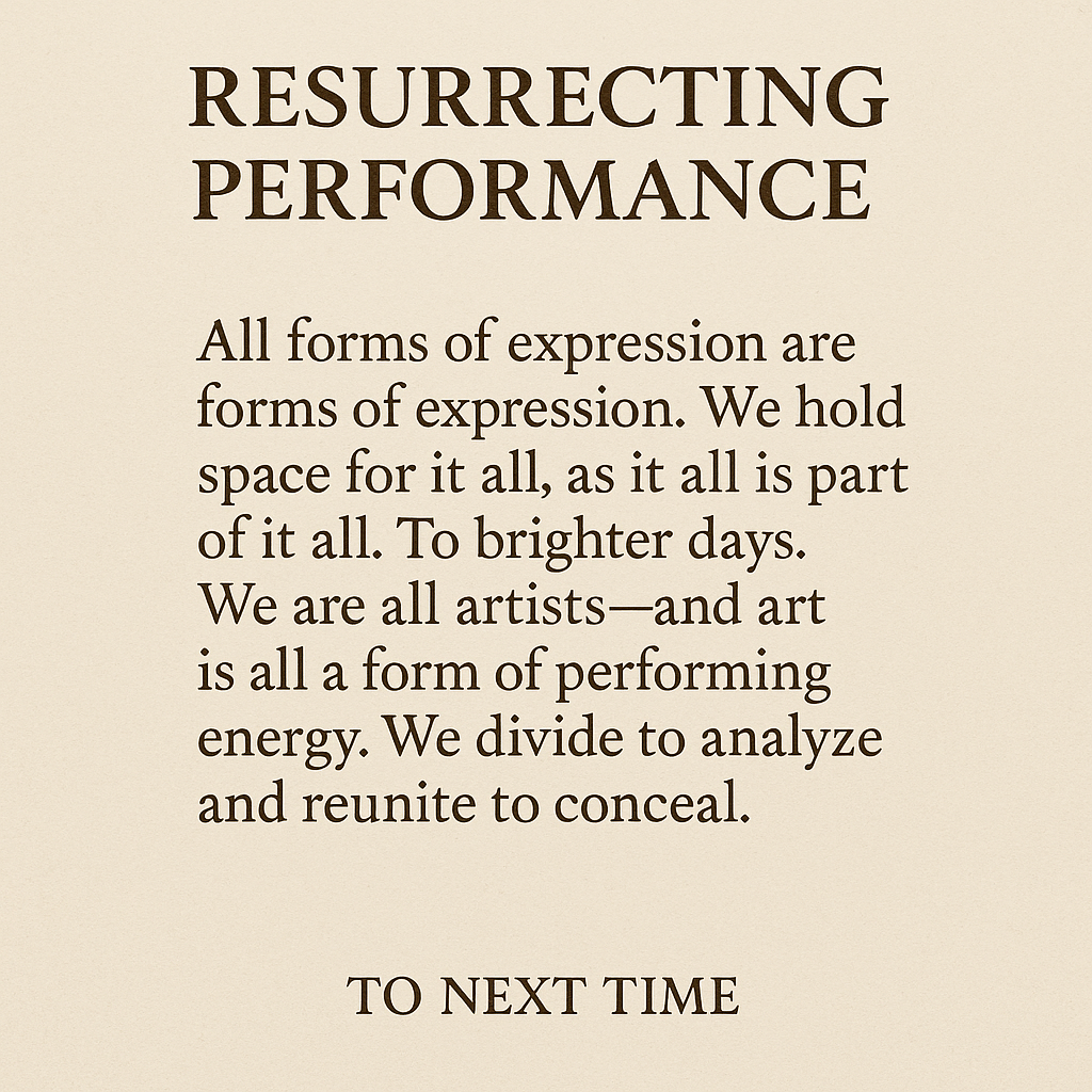 And as we step into the next part of our path, we do so with the knowing that we are all performers in the grand ritual of becoming. No longer afraid to be seen, no longer addicted to hiding. Our truth is sacred, and performance is the river that delivers it.